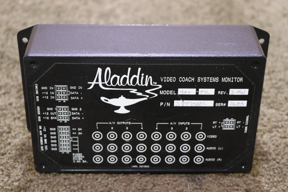 USED 38070302 ALADDIN VIDEO COACH SYSTEM MONITOR RV PARTS FOR SALE PRICE $1,000.00 + $18.99 SHIPPING. CONDITION - USED. READY TO SHIP. RV/MOTORHOME USED VIDEO COACH SYSTEM MONITORS. CALL VISONE RV (606) 843-9889 TO ORDER OR JUST ADD TO SHOPPING CART FOR EASY CHECKOUT. ALADDIN CONTROL NO. 37118B1N3B WORLDS LARGEST SELECTION OF USED RV/MOTORHOME PARTS FOR SALE. ALSO A SELECTION OF INTERESTING ITEMS RELATED TO INSURANCE SALVAGE. NOTE: ALL USED ITEMS AND PARTS ARE ALWAYS SOLD AS-IS WITH NO RETURNS. HOWEVER, AT VISONE RV, WE DO TEST ALL ELECTRICAL COMPONENTS - PRODUCTS. THEY ARE IN WORKING ORDER BEFORE SHIPPING OR PICK-UP SO THAT OUR CUSTOMERS CAN BUY WITH CONFIDENCE! ITEM AVAILABLE FOR SHIPPING. TO ORDER PLEASE CALL VISONE RV (606) 843-9889 OR ADD TO SHOPPING CART FOR EASY CHECKOUT.