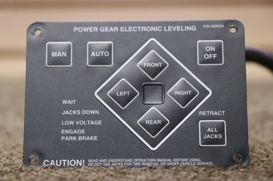 USED MOTORHOME POWER GEAR 500629 ELECTRONIC LEVELING TOUCH PAD FOR SALE READY TO SHIP. RV/MOTORHOME USED LEVELING TOUCH PADS. PRICE $350.00 + $12.99 SHIPPING. CONDITION - USED. CALL VISONE RV (606) 843-9889 TO ORDER OR JUST ADD TO SHOPPING CART FOR EASY CHECKOUT. POWER GEAR STOCK NO. 124068 WORLDS LARGEST SELECTION OF USED RV/MOTORHOME PARTS FOR SALE. ALSO A SELECTION OF INTERESTING ITEMS RELATED TO INSURANCE SALVAGE. NOTE: ALL USED ITEMS AND PARTS ARE ALWAYS SOLD AS-IS WITH NO RETURNS. HOWEVER, AT VISONE RV, WE DO TEST ALL ELECTRICAL COMPONENTS - PRODUCTS. THEY ARE IN WORKING ORDER BEFORE SHIPPING OR PICK-UP SO THAT OUR CUSTOMERS CAN BUY WITH CONFIDENCE! ITEM AVAILABLE FOR SHIPPING. TO ORDER PLEASE CALL VISONE RV (606) 843-9889 OR ADD TO SHOPPING CART FOR EASY CHECKOUT.