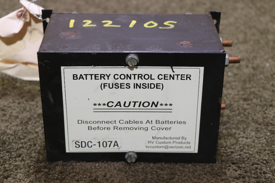 USED BATTERY CONTROL CENTER SDC-107A RV/MOTORHOME PARTS FOR SALE RV/MOTORHOME USED BATTERY CONTROL CENTERS. READY TO SHIP. PRICE $400.00 + $24.99 SHIPPING. CALL VISONE RV (606) 843-9889 TO ORDER. RV CUSTOM PRODUCTS STOCK NO. 122105 WORLDS LARGEST SELECTION OF USED RV/MOTORHOME PARTS FOR SALE. ALSO A SELECTION OF INTERESTING ITEMS RELATED TO INSURANCE SALVAGE. NOTE: ALL USED ITEMS AND PARTS ARE ALWAYS SOLD AS-IS WITH NO RETURNS. HOWEVER, AT VISONE RV, WE DO TEST ALL ELECTRICAL COMPONENTS - PRODUCTS. THEY ARE IN WORKING ORDER BEFORE SHIPPING OR PICK-UP SO THAT OUR CUSTOMERS CAN BUY WITH CONFIDENCE! ITEM AVAILABLE FOR SHIPPING. TO ORDER PLEASE CALL VISONE RV (606) 843-9889 TO ORDER OR ADD TO SHOPPING CART FOR EASY CHECKOUT.