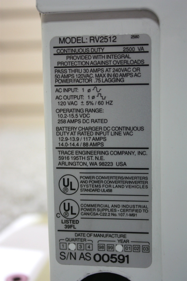USED RV TRACE ENGINEERING RV2512 INVERTER CHARGER FOR SALE